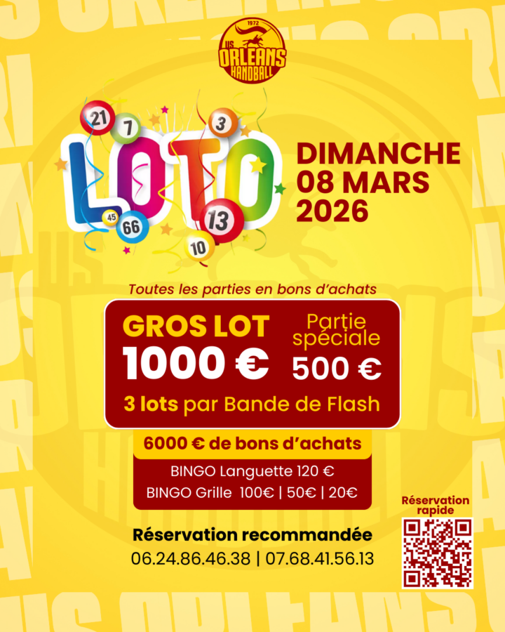 L’US Orléans Handball a le plaisir de vous convier à son premier SUPER LOTO le dimanche 8 mars 2026 ! organise son premier grand LOTO, dimanche 8 mars 20206 à 14h00, au gymnase René Amarger, 48 rue Basse d’Ingré à Orléans, animé par Micheline Cactus.